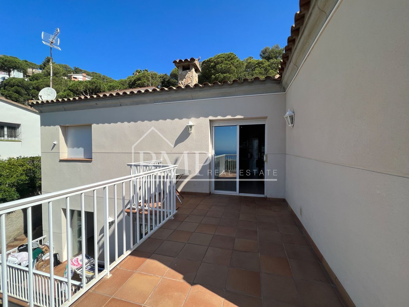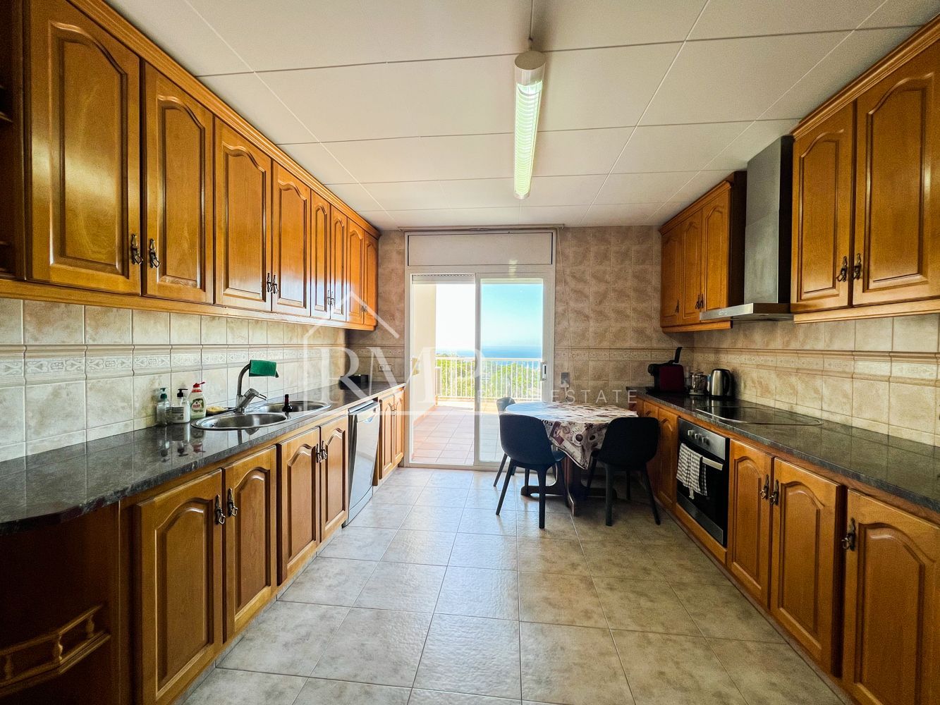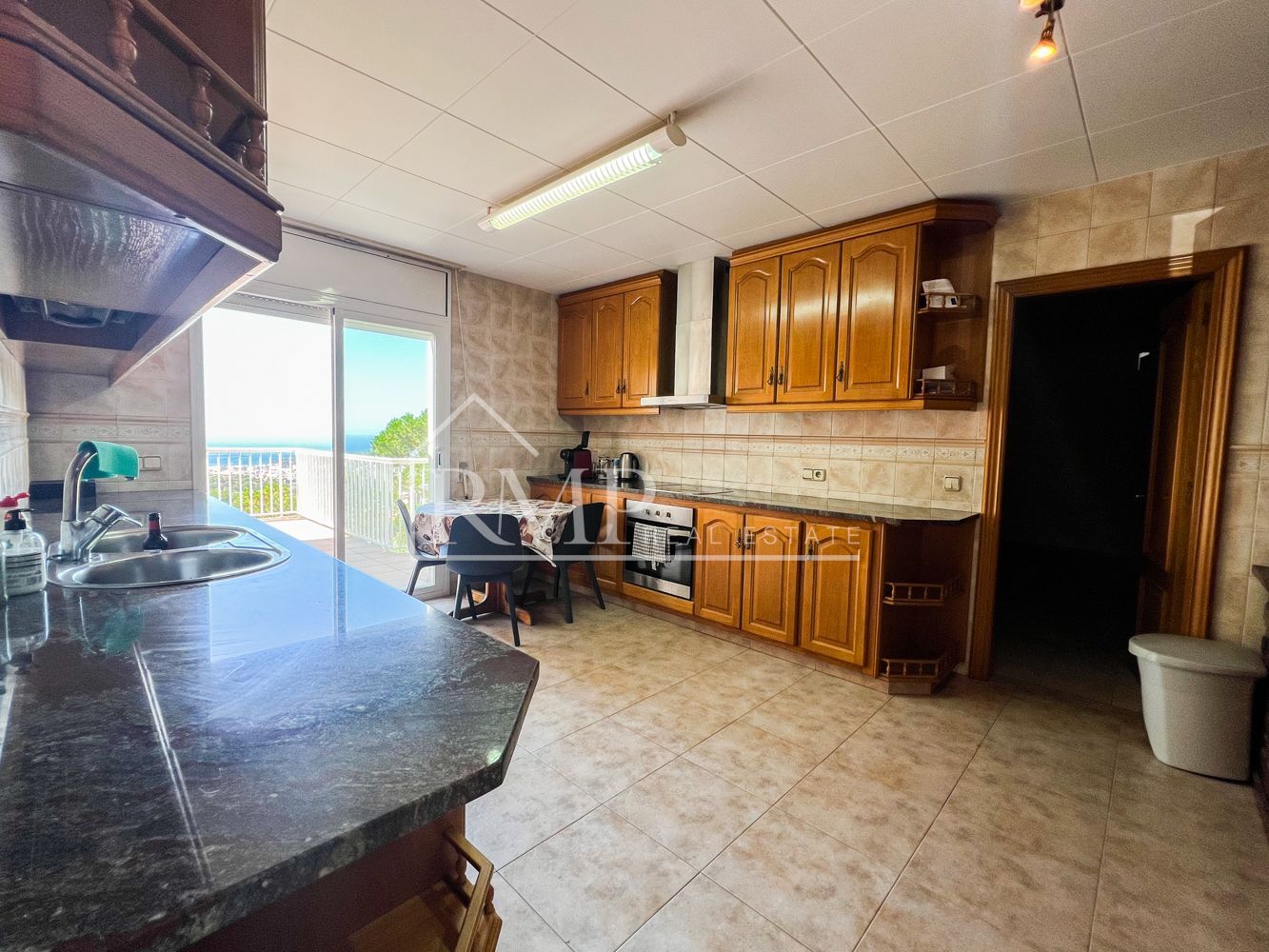 El salón de la casa principal es un espacio acogedor, con una chimenea que aporta calidez durante los meses más fríos y aire acondicionado para el verano. Desde el salón se accede a una terraza que ofrece vistas espectaculares al mar, creando un ambiente perfecto para disfrutar de la tranquilidad y el paisaje. La cocina, completamente independiente, también tiene acceso a la terraza, permitiendo disfrutar de las vistas al mar mientras se cocina.