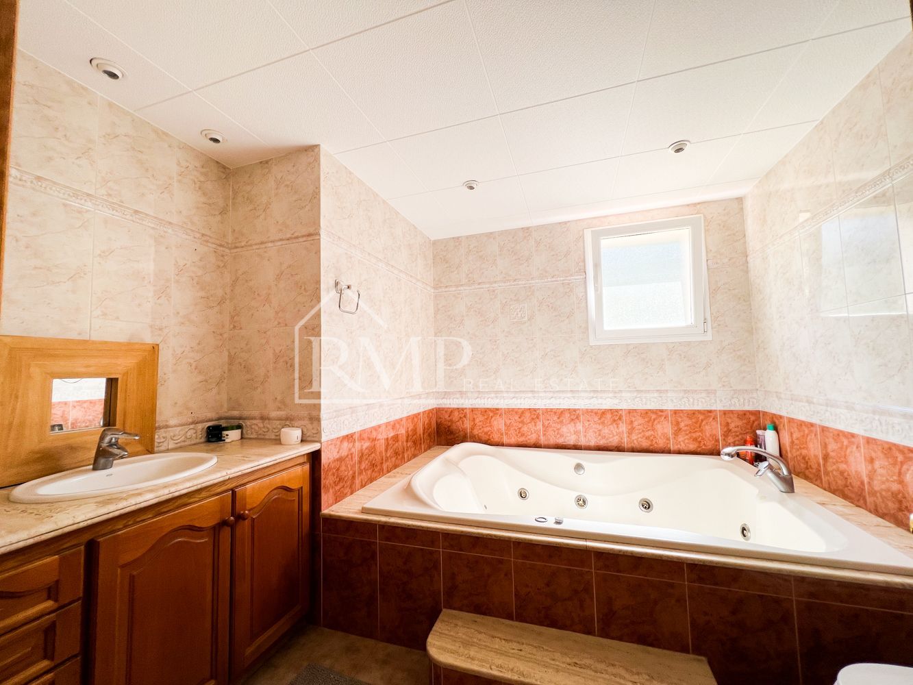 La casa principal cuenta con cuatro habitaciones dobles, proporcionando amplio espacio para toda la familia. Entre las comodidades, destaca un baño en suite equipado con un gran jacuzzi, ideal para momentos de relajación. Además, la casa tiene un baño adicional y un aseo, así como un cuarto independiente destinado a la colada, lo que garantiza máxima comodidad en el día a día.