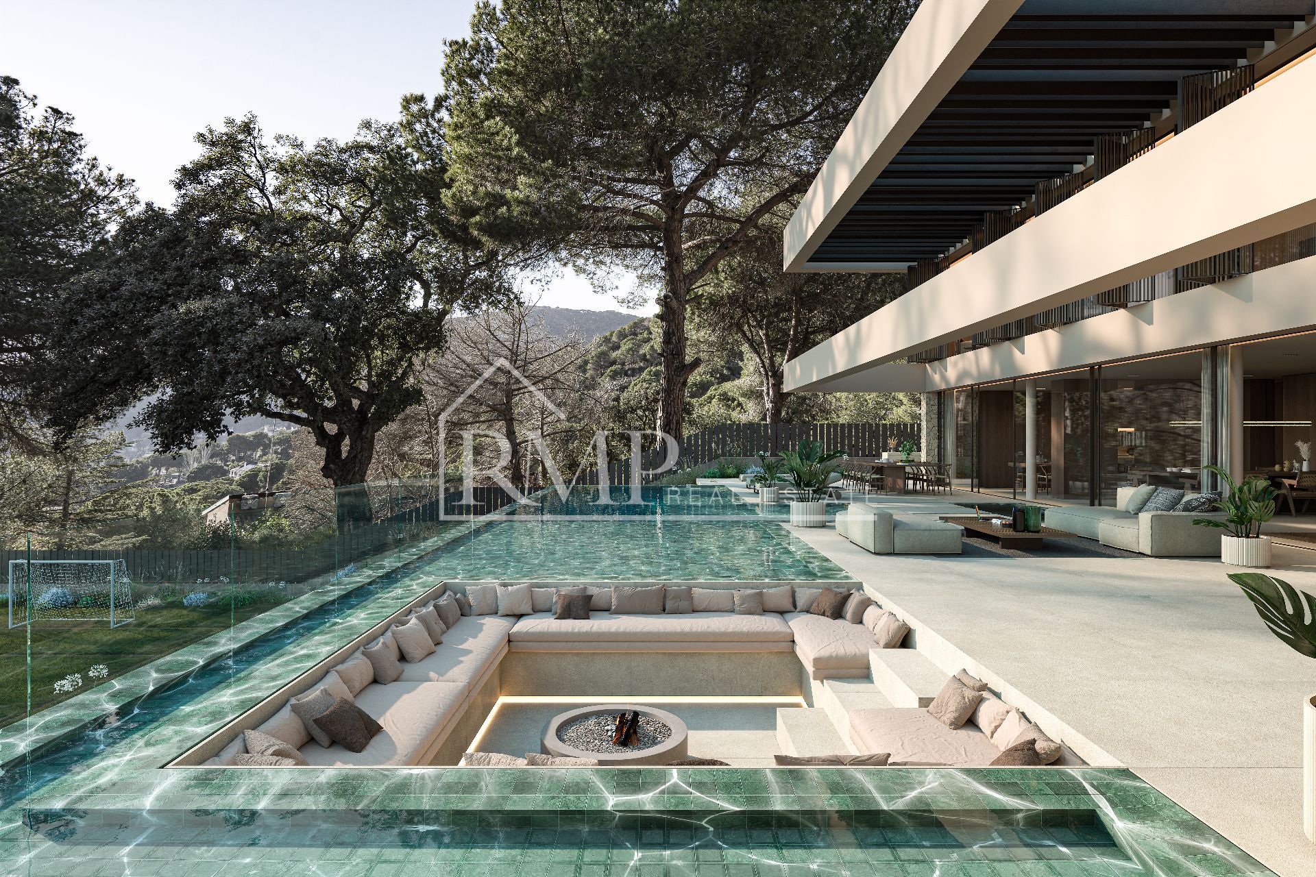 Exterior: La fachada combina piedra y aislamiento térmico en tonos claros, creando luminosidad. Las carpinterías oscuras contrastan armoniosamente con el entorno, y las celosías en las fachadas filtran la luz solar. El jardín, que incluye césped y un campo de fútbol u otro deporte, ofrece diversas opciones recreativas.
