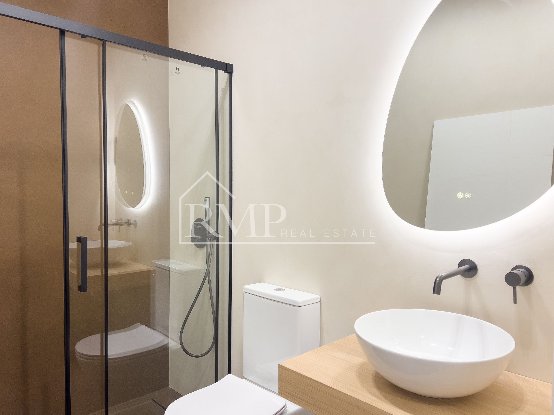Baños: 2 baños modernos con duchas y suelos de microcemento